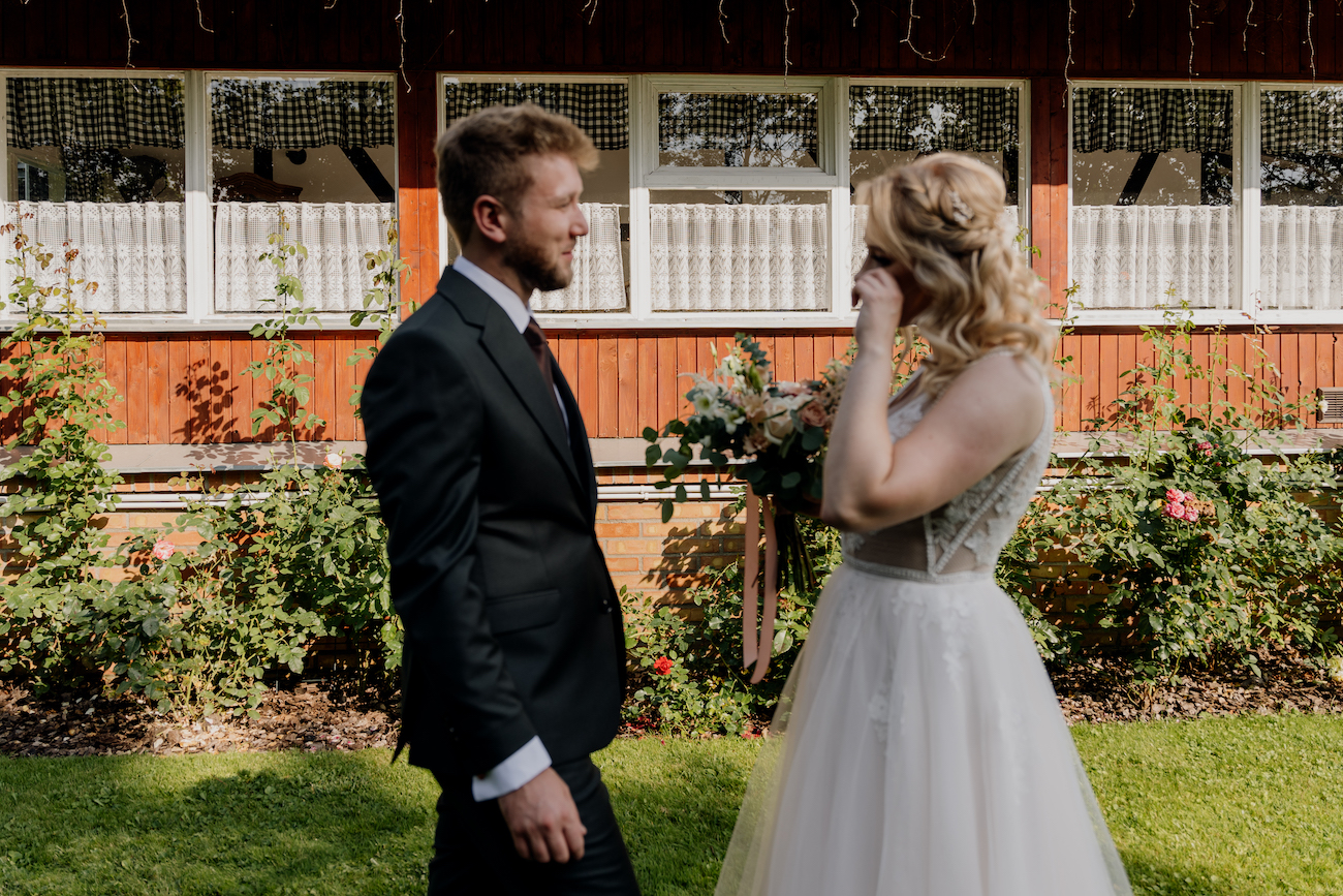 Idę do Asi, do pokoi na piętrze, jest ciut ciemno wewnątrz. Myślę sobie – pokażmy prawdziwy klimat tego miejsca – i proponuję, aby zrobić przygotowania na ganku! Następnie wracam do Pana Młodego – kilka zdjęć na tle zieleni i mamy to! Czas na romantyczny first look – tylko we dwoje…