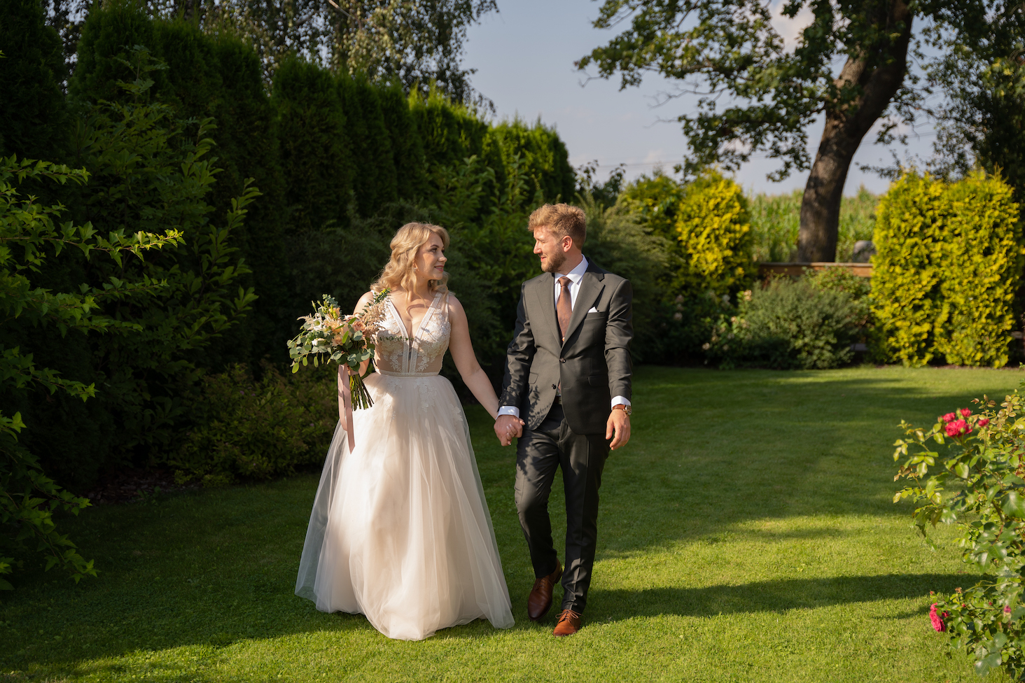 Asia i Mariusz zorganizowali przepiękną ceremonię nad wodą, tuż przed zachodem słońca. Brama przy wejściu na most nad stawem, tak samo jak bukiet ślubny czy dekoracje sali weselnej to dzieło przyjaciółki Panny Młodej. W otoczeniu natury i w kameralnym, rodzinnym gronie powiedzieli sobie „TAK”!